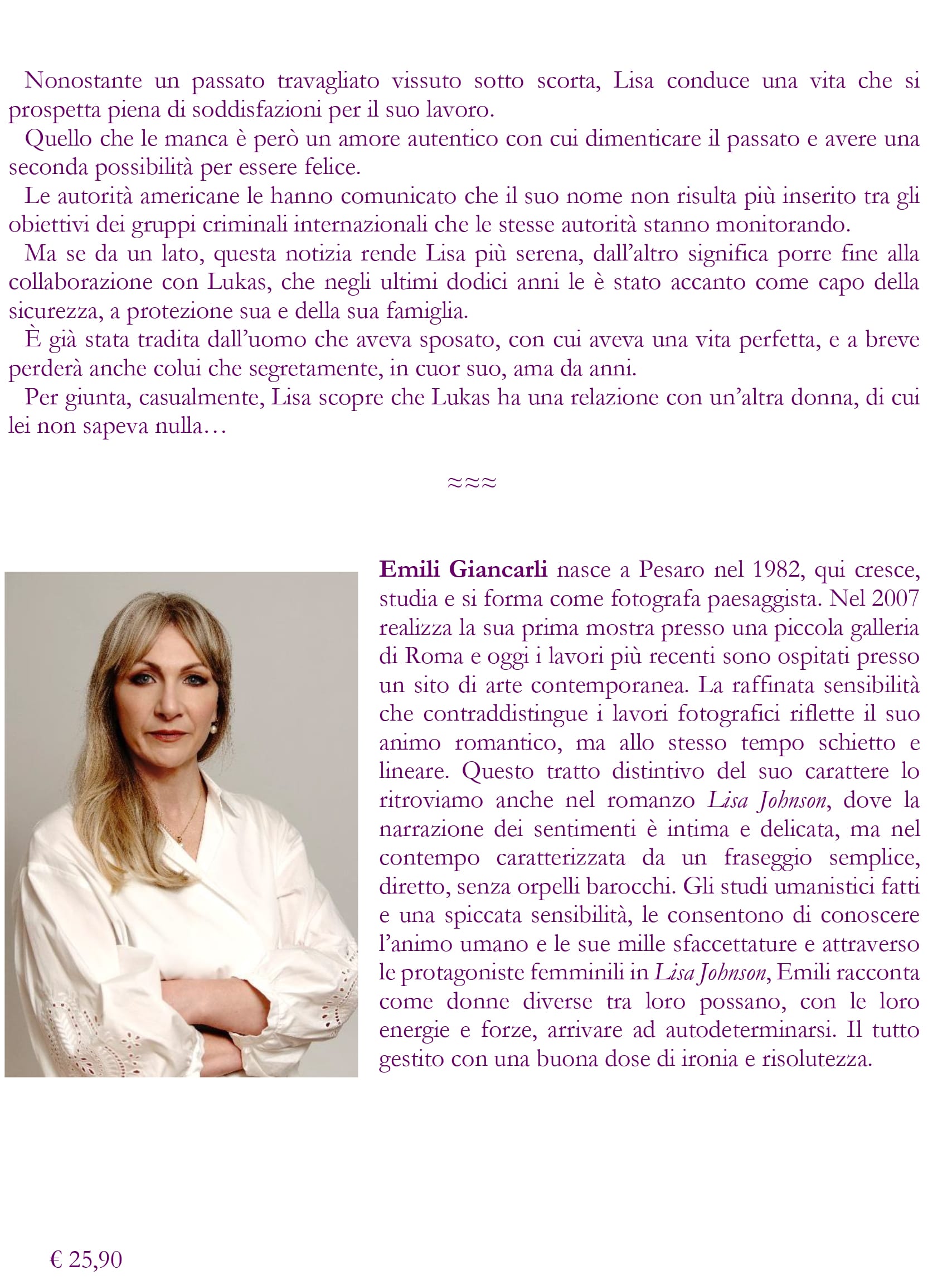 Emili Giancarli nasce a Pesaro nel 1982, qui cresce, studia e si forma come fotografa paesaggista. Nel 2007 realizza la sua prima mostra presso una piccola galleria di Roma e oggi i lavori più recenti sono ospitati presso un sito di arte contemporanca. La raffinata sensibilità che contraddistingue i lavori fotografici riflette il suo animo romantico, ma allo stesso tempo schietto e lineare. Questo tratto distintivo del suo carattere lo ritroviamo anche nel romanzo Lisa Johnson, dove la narrazione dei sentimenti è intima e delicata, ma nel contempo caratterizzata da un fraseggio semplice, diretto, senza orpelli barocchi. Gli studi umanistici fatti e una spiccata sensibilità, le consentono di conoscere l’animo umano e le sue mille sfaccettature e attraverso le protagoniste femminili in Lisa Johnson, Emili racconta come donne diverse tra loro possano, con le loro energie e forze, arrivare ad autodeterminarsi. Il tutto gestito con una buona dose di ironia e risolutezza.