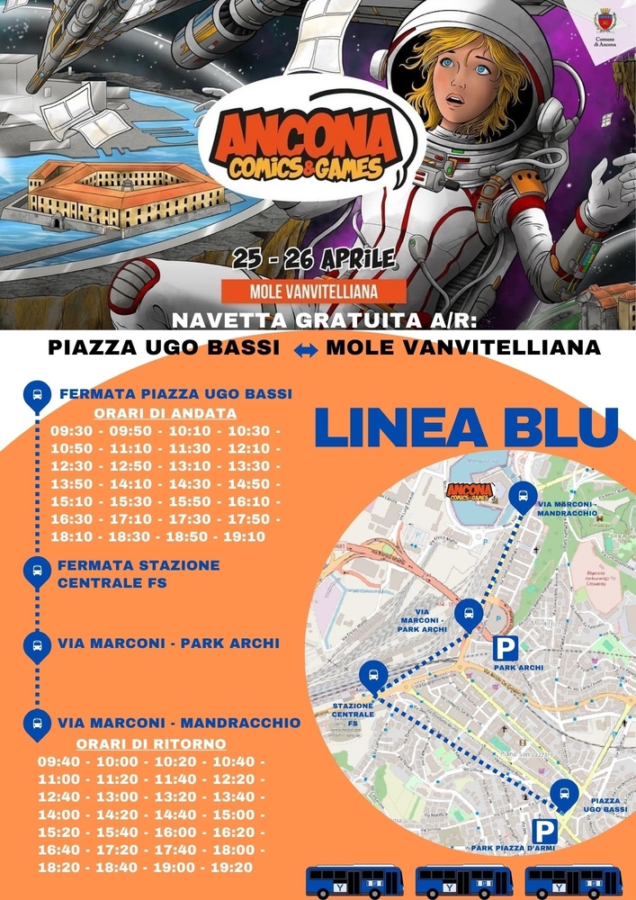 Navette gratuite andata e ritorno da piazza Ugo Bassi alla Mole Vanvitelliana, per informazioni sugli orari consultare il sito Fiere del Fumetto.
