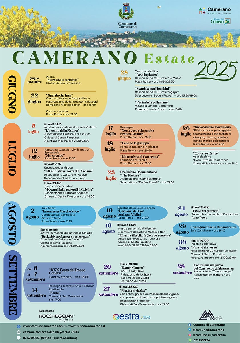 L’estate 2025 a Camerano si preannuncia come un mosaico di esperienze autentiche, accessibili e coinvolgenti, in cui la tradizione incontra l’innovazione e la comunità si apre con entusiasmo a cittadini, turisti e visitatori.
