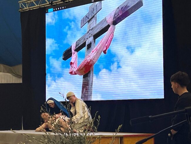 A raccogliere l’invito del Centro Turistico Giovanile Valmusone, che da anni ha in mano l’organizzazione della Passione Vivente di Villa Musone, sono stati circa 70 giovanissimi della Parrocchia di San Flaviano: figuranti in costume tutti tra gli 8 e i 15 anni di età, che hanno interpretato con grande intensità e partecipazione i vari momenti della via Crucis, scanditi con quadri, ovvero le sacre scene della Passione di Cristo, riprodotte all’interno della tensostruttura di Villa Musone: dal processo nel sinedrio, proseguendo con le stazioni della via Crucis e concludendo con la scena della Pietà dopo la morte di Gesù, i presenti hanno potuto assistere ad un vero e proprio racconto – punteggiato dagli insert del coro, come in una tragedia antica – che ha unito profondità evangelica e autenticità espressiva, dando vita ad una rappresentazione pressoché unica in Italia, proprio per la scelta di affidare alla narrazione e allo sguardo dei più piccoli un evento di tale portata.