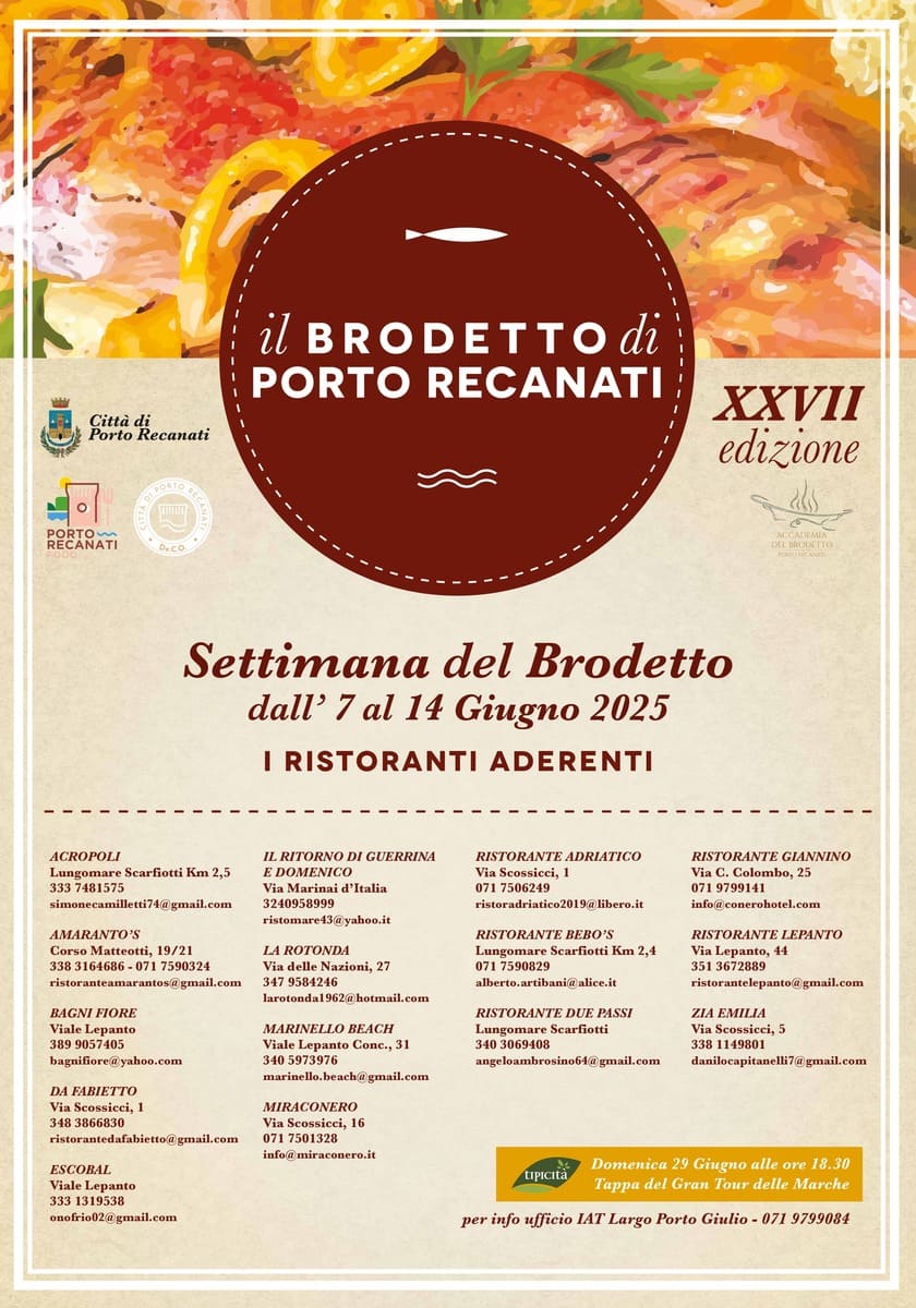 Dal 7 al 14 giugno a Porto Recanati, la 27ª “Settimana del Brodetto” celebra sapori autentici, memoria marinara e l’unicità della sua più antica ricetta marchigiana