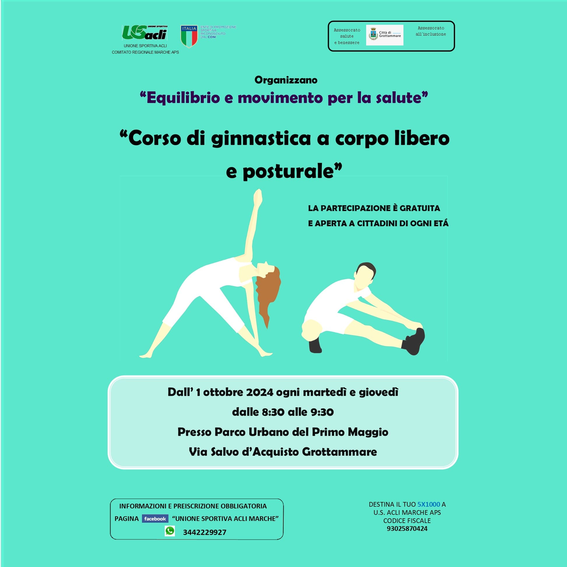 Il progetto consiste in un corso gratuito di ginnastica a corpo libero e posturale organizzato dall’Unione Sportiva Acli Marche Aps in collaborazione con il Comune di Grottammare, assessorati alla salute e al benessere e inclusione.