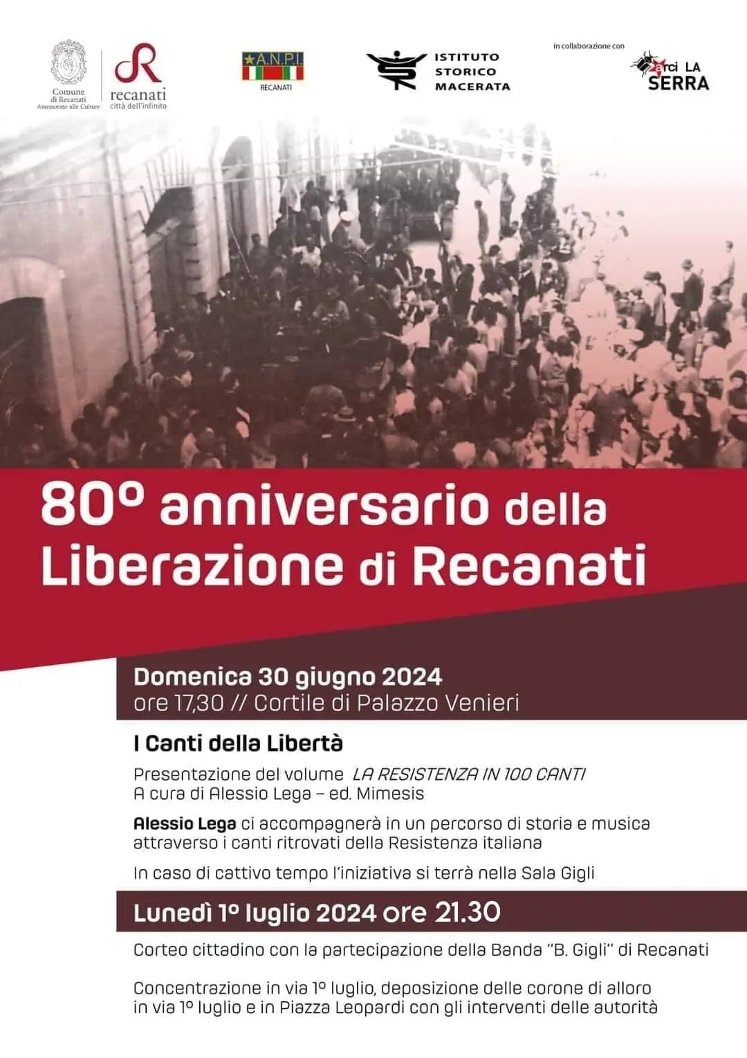 Recanati, 30 giugno 2024 – Il circolo ARCI La Serra di Recanati collabora alle iniziative che si terranno il 30 giugno e il 1° luglio per l’ottantesimo anniversario della Liberazione di Recanati dal nazifascismo, organizzate dal Comune di Recanati, l’Istituto Storico di Macerata e la sezione ANPI di Recanati.