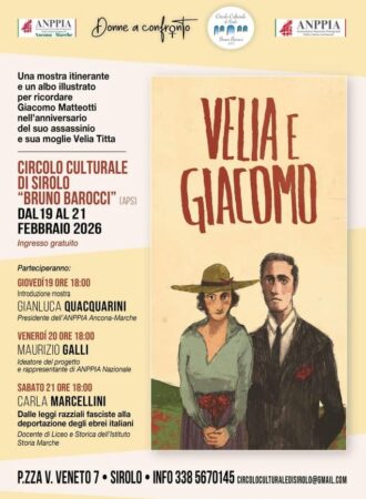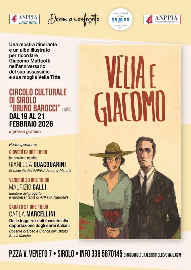 Sirolo, 16 febbraio 2026 – Un appuntamento importante per custodire la memoria, rivivere la storia e rafforzare la coscienza civile delle nuove generazioni. Dal 19 al 21 febbraio, il Circolo Culturale di Sirolo Bruno Barocci ospita la seconda tappa marchigiana della mostra itinerante Velia e Giacomo, accompagnata dall’albo illustrato e dall’animazione 2d dedicati soprattutto all’ambito familiare e privato di Giacomo Matteotti, con un’attenzione particolare a sua moglie Velia Titta.