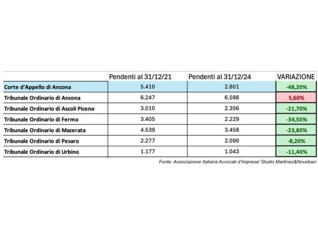 Ancona, 9 ottobre 2025 – Nonostante tra il 2021 e il 2024, presso le Corti d’Appello italiane si sia registrato un calo medio del 24% dei procedimenti civili pendenti, in alcuni tribunali, soprattutto a Venezia (+159%) e Trieste (+73,7%) e L’Aquila (+48,5%), l’arretrato delle cause civili continua ad aumentare. È quanto emerge da un’analisi condotta dall’Associazione Italiana Avvocati d’Impresa, presieduta dall’avvocato Antonello Martinez. Su un totale di 140 tribunali solo 17 hanno registrato un incremento, mentre i restanti 123 hanno evidenziato una riduzione dei procedimenti civili pendenti, con le diminuzioni più significative a Palmi (-45,6%), Arezzo (-44,2%), Barcellona Pozzo di Gotto (-43,9%), Lodi (-42,9%), Rovigo (-41,4%), Foggia (-41,4%) e Larino (-40,8%).
