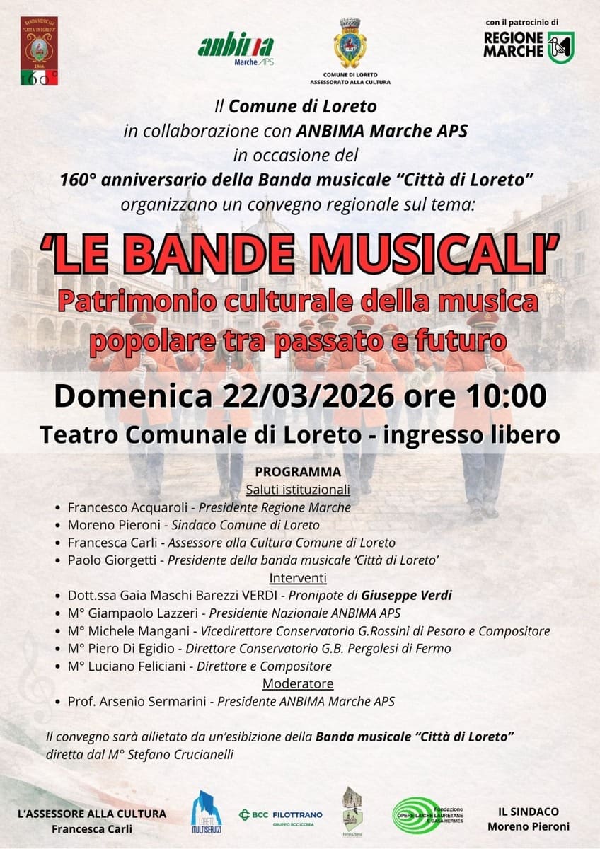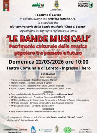Tra queste, un convegno a carattere regionale per ribadire il ruolo determinante delle bande musicali quali patrimonio culturale della musica popolare senza soluzione di continuità tra passato e futuro, che si terrà al Teatro Comunale di Loreto domenica 22 marzo prossima alle ore 10. Organizzato dal Comune di Loreto in collaborazione con Anbima Marche APS, il convegno vedrà un confronto sui temi culturali, organizzativi e sulle specificità delle bande musicali marchigiane tra istituzioni, stakeholder, musicisti ed esponenti dell’associazionismo bandistico.