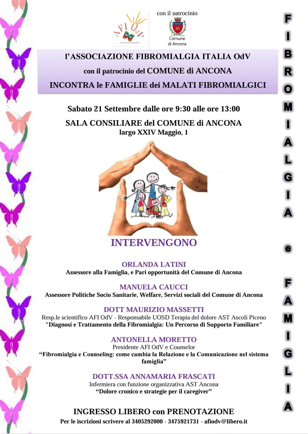 Dopo l’intervento delle due amministratici comunali il programma prevede quello del responsabile scientifico della associazione, dott. Maurizio Massetti (resp. UOSD Terapia del dolore AST Ascoli Piceno) su Diagnosi e trattamento della Fibromialgia: un percorso di supporto familiare; quindi quello della presidente AFI OdV e counselor Antonella Moretto su Fibromialgia e Counseling: come cambia la relazione e la comunicazione nel sistema famiglia e infine della dott.ssa Annamaria Frascati, infermiera con funzione organizzativa AST Ancona su Dolore cronico e strategie per il caregiver.