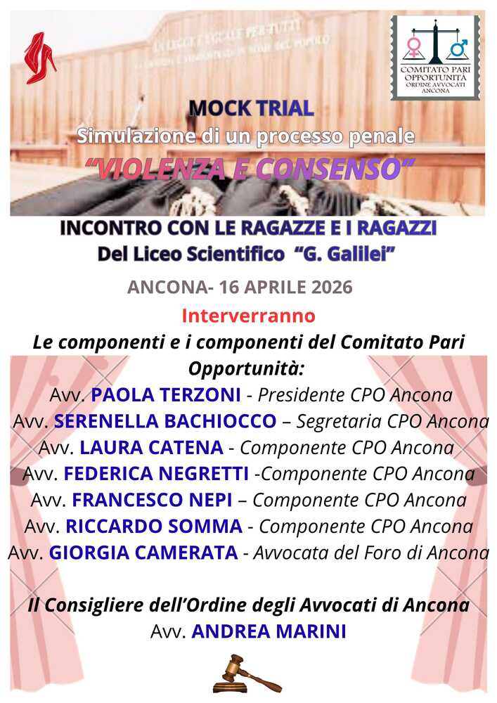Ancona, 15 aprile 2026 – Mock trial, Simulazione di un processo penale: Violenza e Consenso è il titolo dell’incontro promosso e organizzato dal Comitato Pari Opportunità presso l’Ordine degli Avvocati di Ancona con gli studenti delle classi 3B, 3G, 3E del Liceo Scientifico Galilei di Ancona. La mattinata prevede, nell’Aula Magna del Liceo, un confronto sul tema e la simulazione di un processo penale per violenza di genere.