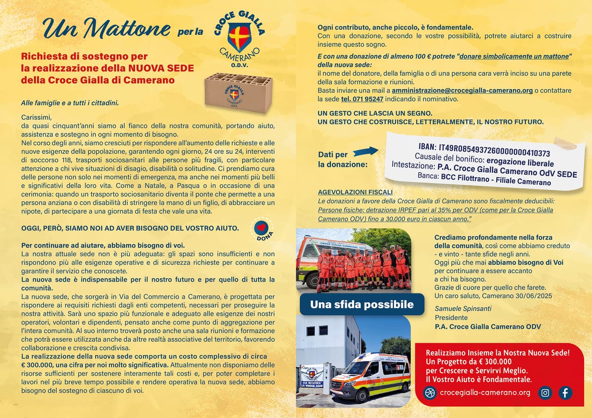 In un periodo storico dove l’individualismo sembra prevalere, scegliamo di restare uniti, di sostenere chi ogni giorno ci ricorda che aiutarsi reciprocamente è la chiave per superare ogni avversità. La Croce Gialla di Camerano ci chiama, e insieme possiamo rispondere con forza ed entusiasmo.